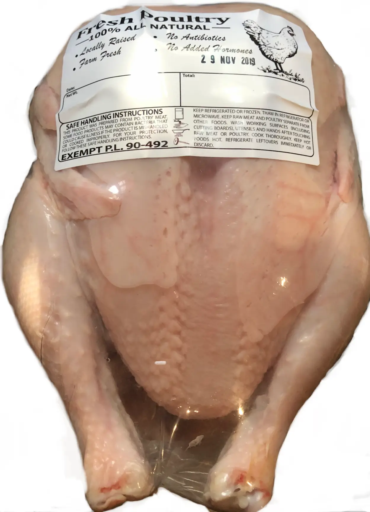 Ready for pick up, your farm fresh whole chicken ready to eat will weigh approximately 3 to 4 pounds but the chicken is sold as a whole not by the pound.